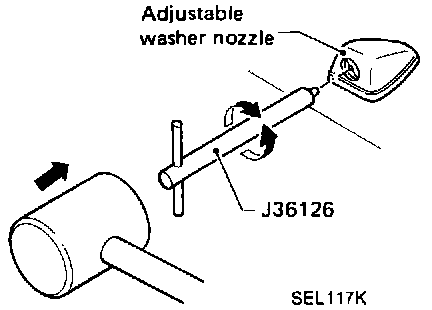 ^ Using washer nozzle adjusting tool (Tool number: J36126). adjust windshield washer nozzle to correct its spray pattern.
