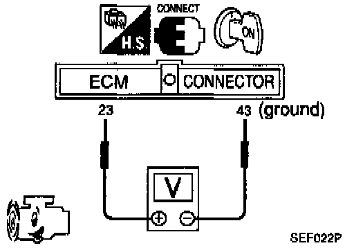 B) Check the voltage between ECM terminal 23 and 43 (ground) and make sure the following: