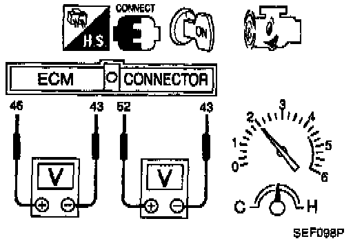 2) Set voltmeters probes between ECM terminals 46 (front heated oxygen sensor signal) and 43 (engine ground), and ECM terminals 52 (rear heated oxygen sensor signal) and 43 (engine ground).