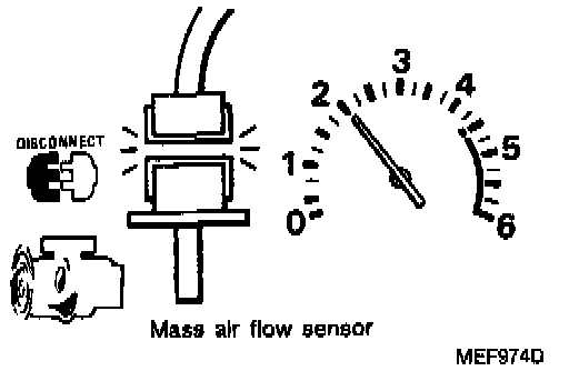 3) Disconnect mass air flow sensor harness connector. Restart and run engine for at least 30 seconds at 2,000 rpm.