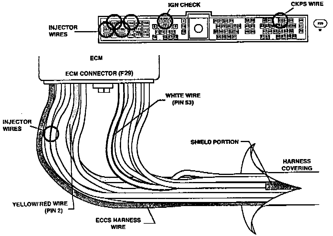 3. If steps 1 & 2 do not resolve the incident, open the ECM end of the ECCS harness approximately 30 cm (12 inches). Find and separate the white wire (pin 53) from the Yellow/Red wire (pin 2) and the four fuel injector wires (pins 102, 107, 104, 109). These two (2) groups of wires should be separated from each other the entire distance from the ECM connector (F29) to the shield portion of the white wire (approximately 30 cm [12 inches]).