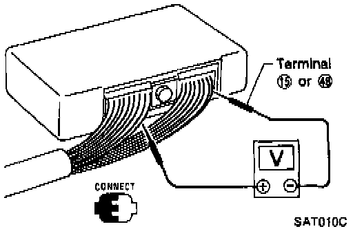 Measure voltage between each terminal and terminal 15 or 48, by following "A/T CONTROL UNIT INSPECTION TABLE".