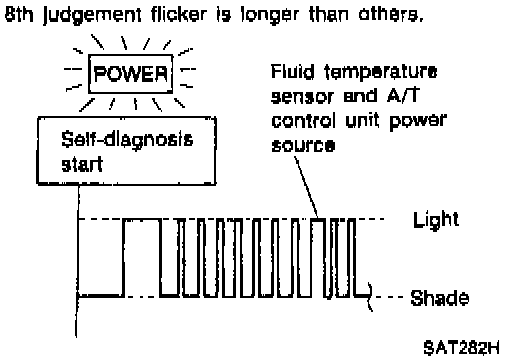 2. Drive vehicle under the following conditions: Shift lever in D, vehicle speed higher than 10 km/h (6 MPH), throttle opening greater than 1/8 of the full open position, engine speed higher than 450 rpm and driving for more than 10 minutes.