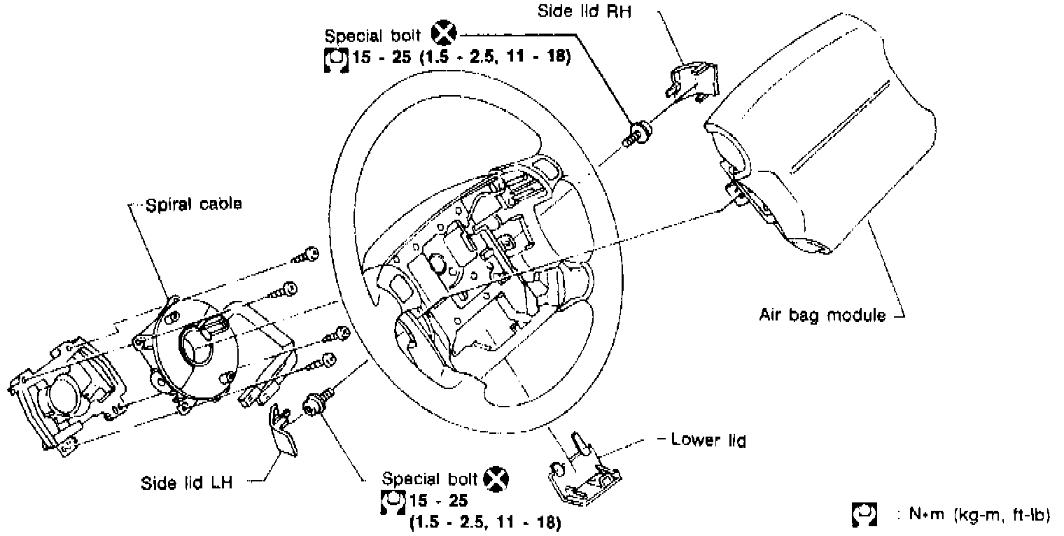 Before attempting SRS service, turn ignition Off, then disconnect battery ground cable. Wait at least 10 minutes after disconnecting cable before performing any procedures. The SRS uses special bolts which are coated with a bonding agent. Discard old bolts after removal, then replace with new ones.DRIVER SIDE