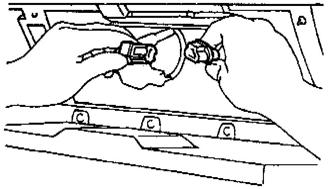 2. Remove glove compartment lid and connector bracket, then disconnect passenger air bag inflator electrical connector from body connector.