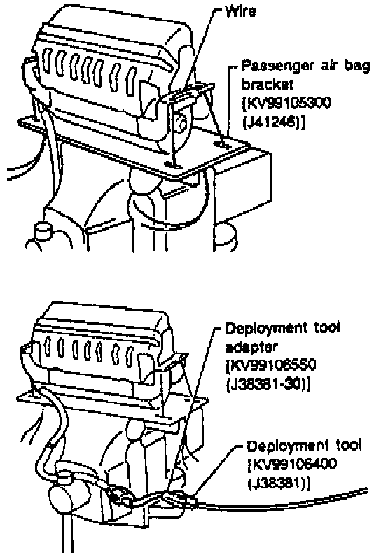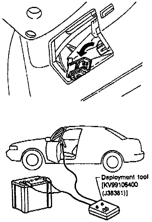 c. Connect adapter No. KV991065S0 (Kent-Moore J3838-1) to deployment tool No. KV99106400 (Kent-Moore J38381),or equivalent, and to passenger air bag electrical connector.