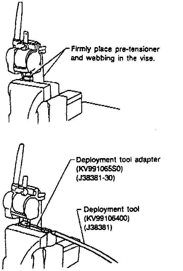 3. Connect adapter No. KV991065S0 (Kent-Moore J38381-30) to deployment tool No. KV99106400 (Kent-Moore J38381), or equivalent, and to seat belt pre-tensioner electrical connector.