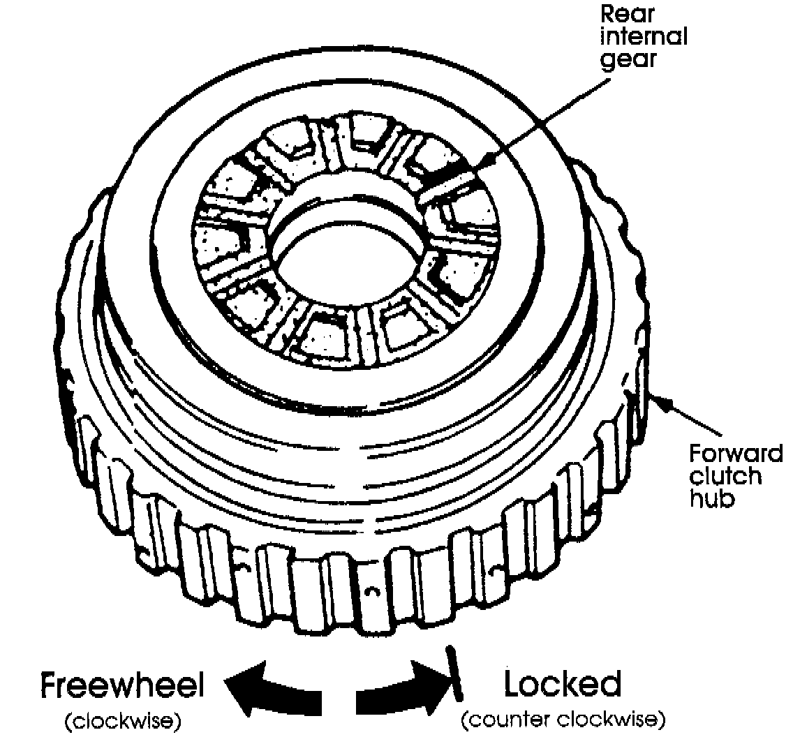 Some manuals may be misleading when describing proper forward sprag rotation. When properly assembled, the forward clutch hub should freewheel clockwise and lock counter clockwise with the rear internal gear held stationary.