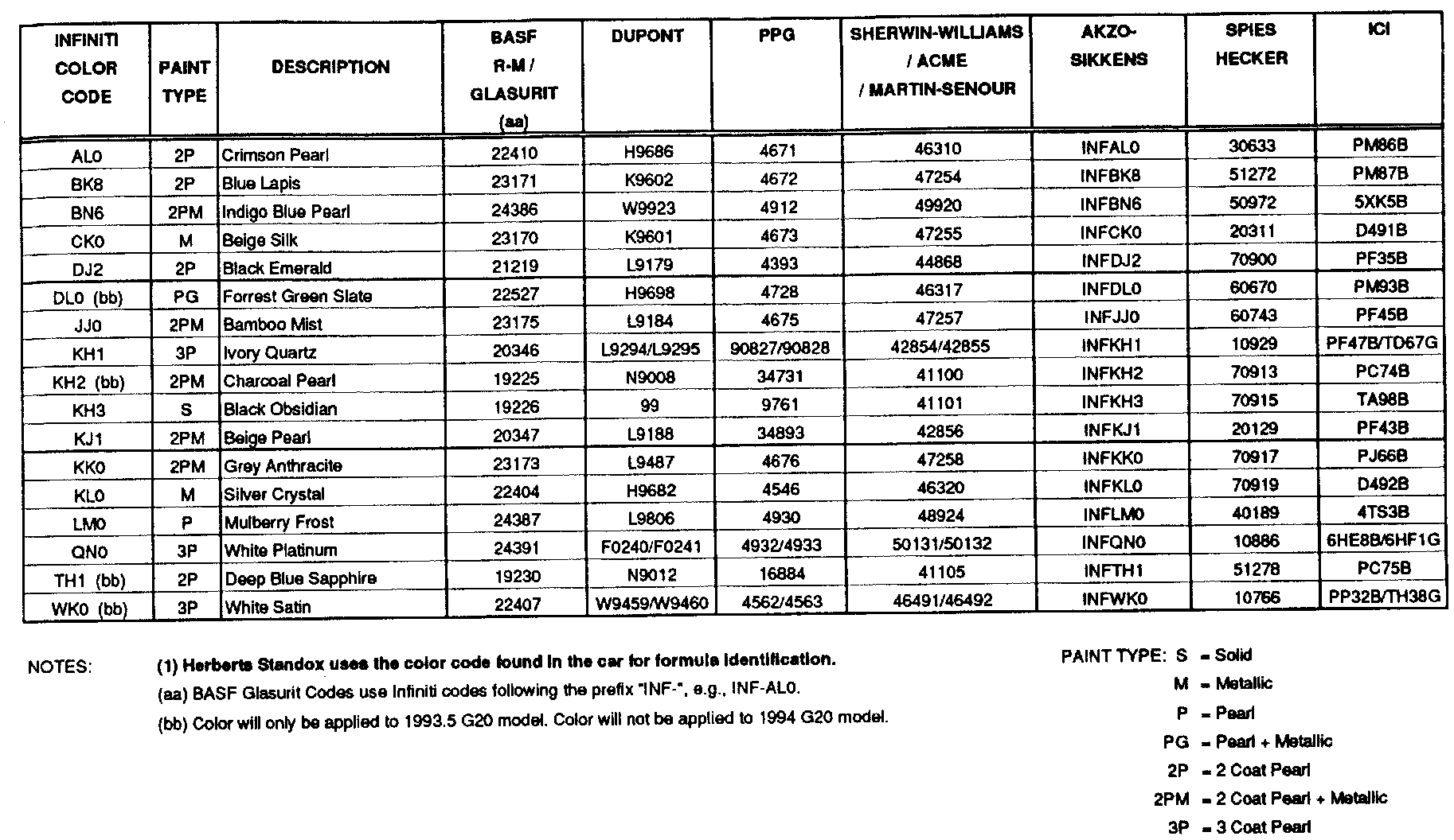 The following is a listing of all 1994 Infiniti paint codes, color names, and refinish paint codes for major automotive paint manufacturers.
