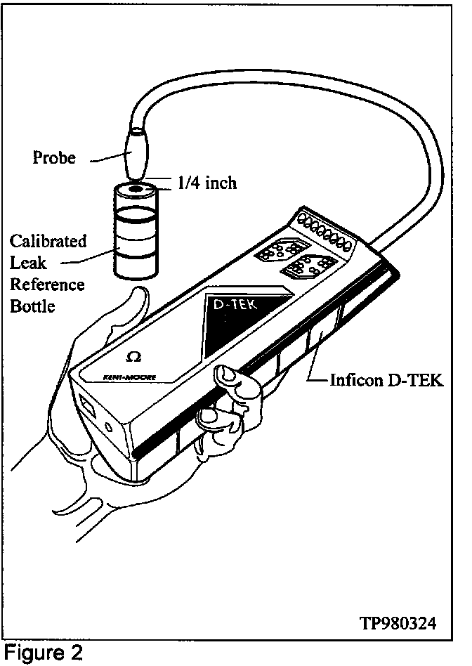 5. To calibrate the D-TEK, slowly pass the probe tip about ... of an inch over the leak reference bottle, moving the probe about 1 - 2 inches per second to detect a leak rate of 0.5 ounces per year (see Figure 2). The alarm will sound and several yellow lamps will illuminate. Once the yellow lamps go out, the unit will have an audible click (about 2 clicks per second) which indicates the D-TEK is ready to use.