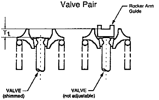 Each cylinder contains two intake valves and two exhaust valves. Each pair of valves is operated by one Y-shaped rocker arm. One valve in each pair contains a rocker arm guide which is not adjustable. The matching valve contains a replaceable shim. A hydraulic lash adjuster (HLA) is also included in the system and acts as the rocker arm pivot.