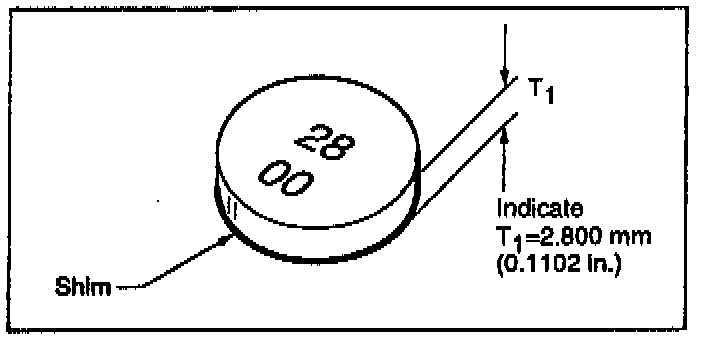 7. Match the measured "T1" dimension (in inches) to the available shim chart (in millimeters) located in the S.D.S. section of the appropriate service manual. (The "T1" dimension is equivalent to the thickness and size designation of the valve shim.) Select the closest size shim to the measured "T1" dimension. For example, if the measured "T1" dimension is 0.1154 in. use a 2.925 mm shim. Shims are available in 17 different thicknesses ranging from 2.800 mm (0.110 in.) to 3.200 mm (0.126 in.) and increase in increments of 0.025 mm (0.001 in.). Refer to the NMC parts fiche for appropriate part numbers.