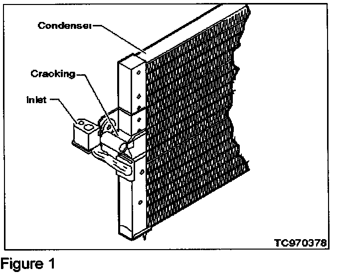If a 1991-96 G20 exhibits refrigerant leaking from the condenser inlet tube, this condition may be caused by a stress crack at the base of the condenser inlet tube (see Figure 1).