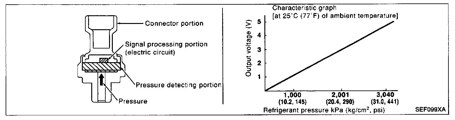 The triple pressure sensor is installed at the liquid tank of the air conditioner system. The sensor uses an electrostatic volume pressure transducer to convert refrigerant pressure to voltage. The voltage signal is sent to ECM, and ECM controls cooling fan system.
