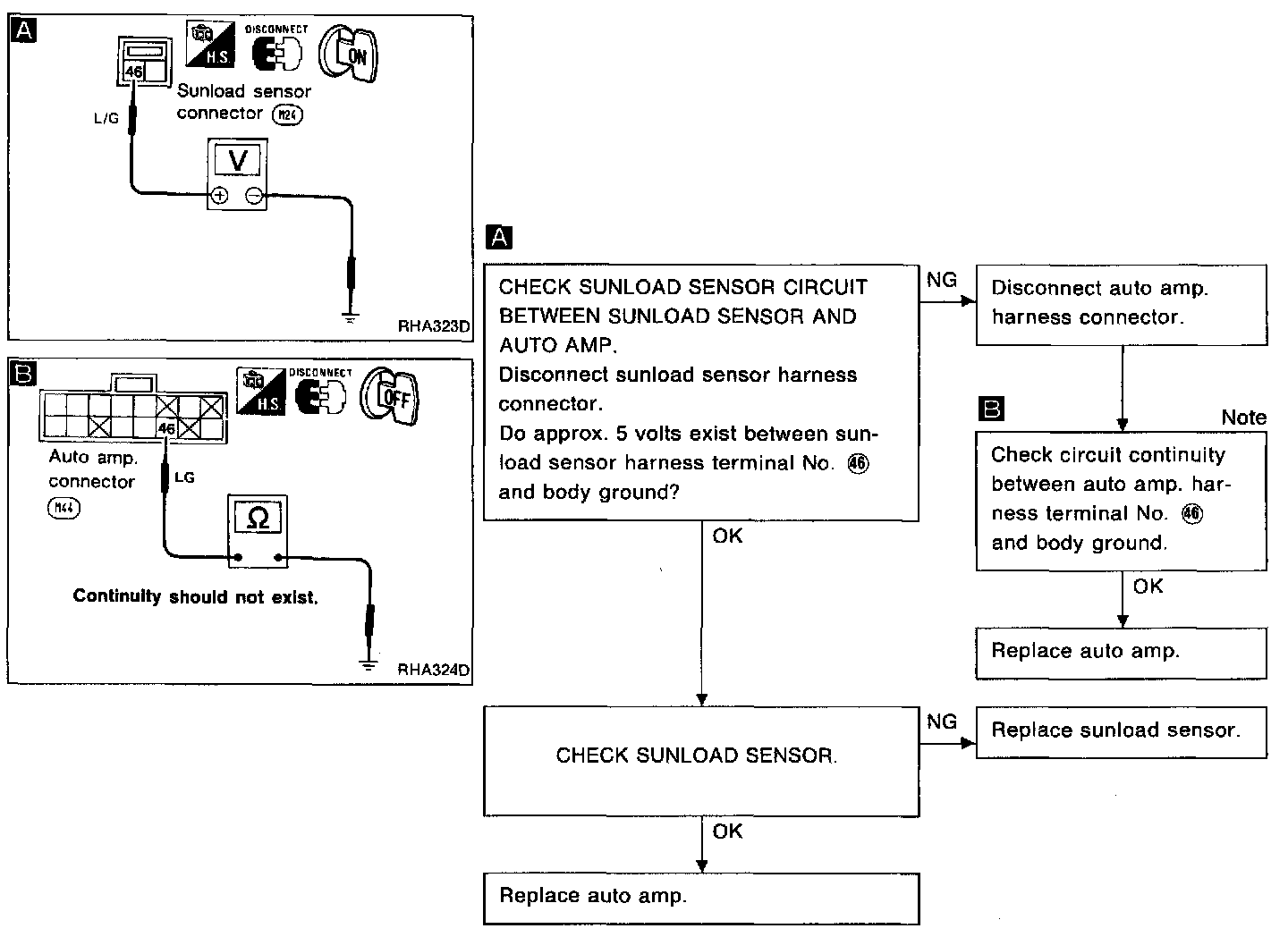 SYMPTOM: Sunload sensor circuit is shorted. (-25 is indicated on auto amp. as a result of conducting Self-diagnosis STEP 2; or SUNLOAD SENSOR [SHORT] (-b) is indicated on CONSULT as a result of conducting "SELF-DIAGNOSIS RESULTS" mode with CONSULT.)