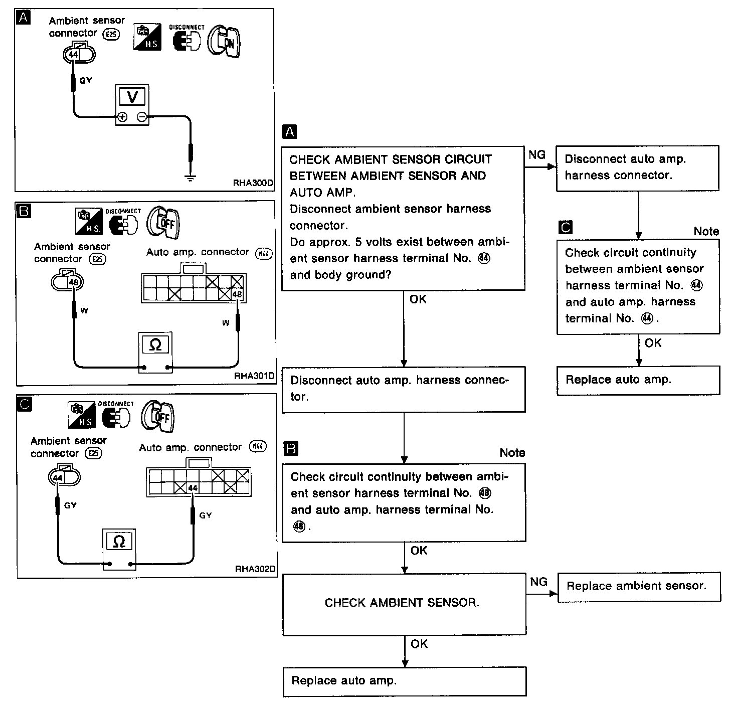 SYMPTOM: Ambient sensor circuit is open. (21 is indicated on auto amp. as a result of conducting Self-diagnosis STEP 2; or AMBIENT SENSOR [OPEN] (-a) is indicated on CONSULT as a result of conducting "SELF-DIAGNOSIS RESULTS" mode with CONSULT.)