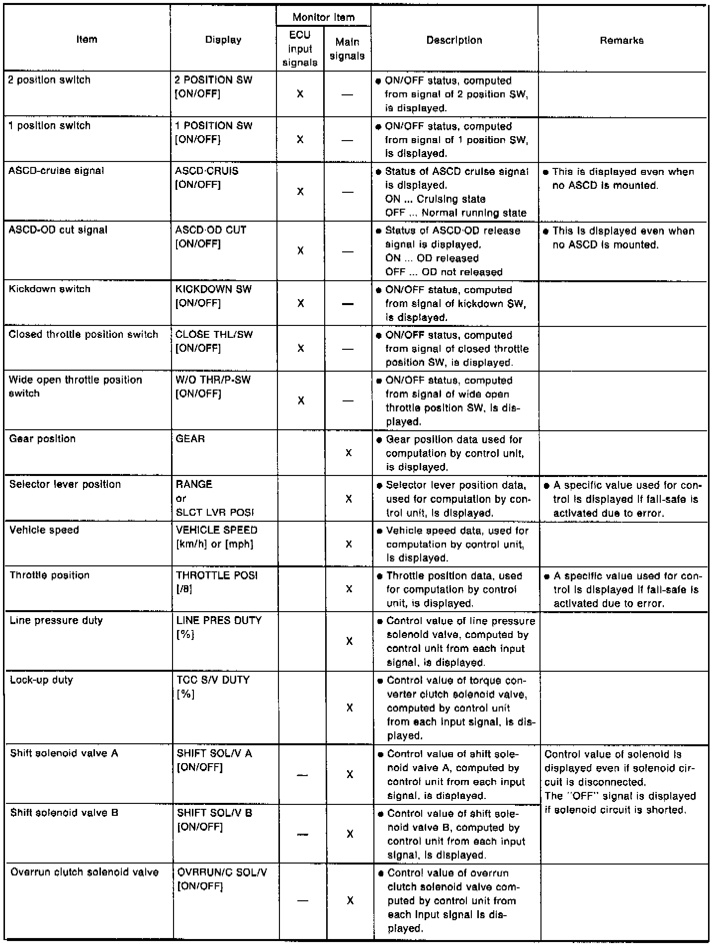 - When select main signals on CONSULT, monitored items for understanding the overall operation of the system are set, and this setting is indicated by a reversed display.