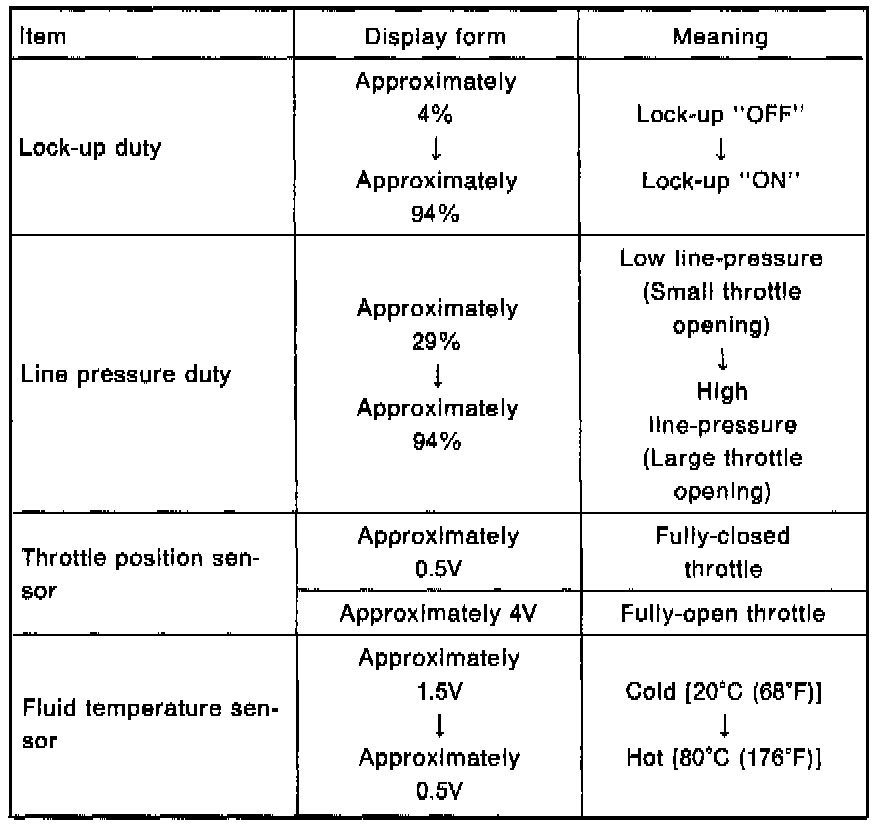 1. The CONSULT electrically displays shift timing and lock-up timing (that is, operation timing of each solenoid).