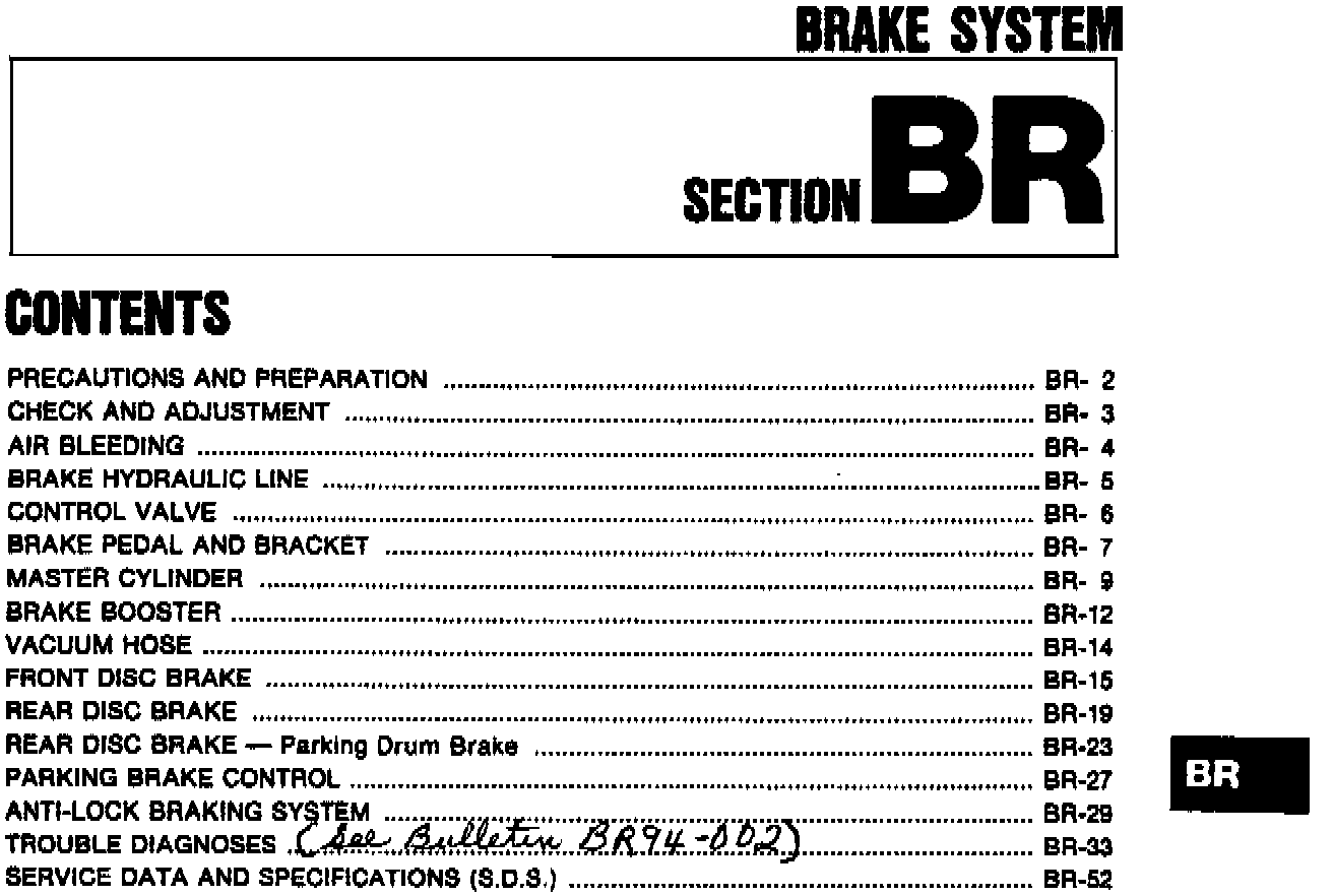 The pages for Brake System Trouble Diagnoses Section of the 1993 and 1994 J3O Service Manuals have been amended. Please reference this Bulletin on the Contents page of the BR Section of both Service Manuals as shown.