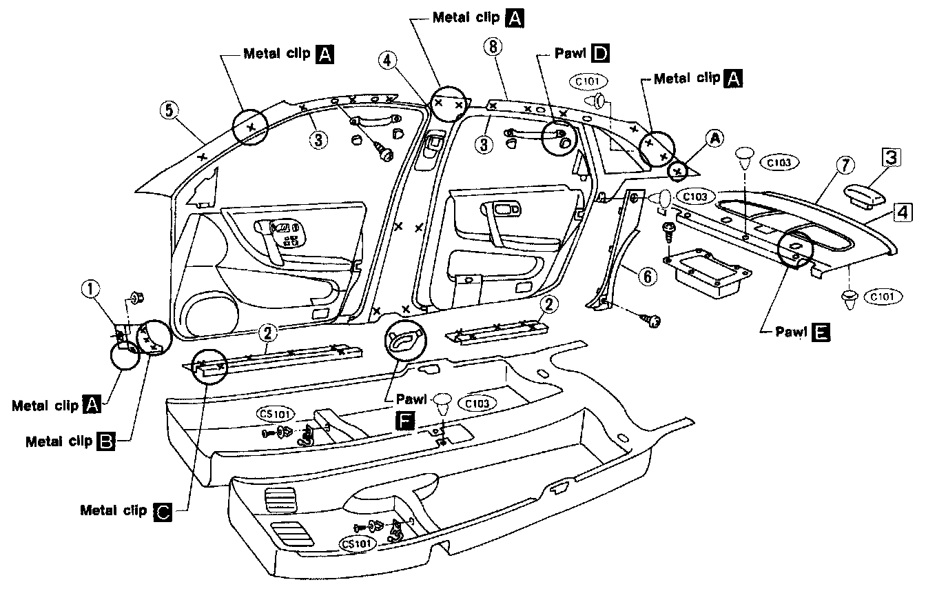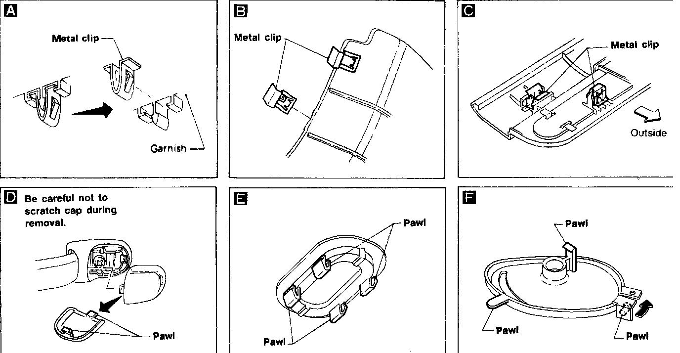 ^ Be sure to remove front, center and rear pillar garnishes by pulling them straight out. Use a long-flat-bladed screwdriver when removing metal clips from rear pillar garnish "A".