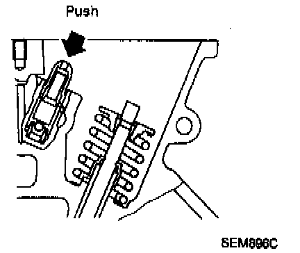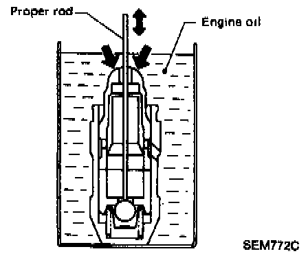 b) Remove hydraulic lash adjuster and dip in a container filled with engine oil. While pushing plunger as shown in figure, lightly push check ball using a thin rod. Air is completely bled when plunger no longer moves.