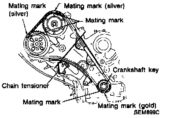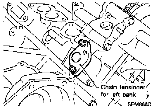 14. While aligning matching marks on crankshaft sprocket and camshaft sprockets (on both intake and exhaust sides) with those on chain, install chain on left bank.