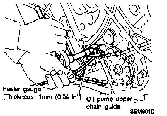 - Place a 1 mm (0.04 in) feeler gauge between the upper chain guide and chain before assembling chain guides. Force applied to chain is equivalent to upper chain guide weight.