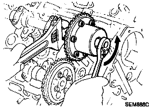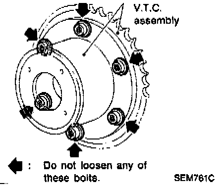 CAUTION: Valve timing control (V.T.C.) assembly Do not attempt to disassemble V.T.C. assembly since they are difficult to reassemble accurately in the field. It they should be disassembled, V.T.C. assembly must be replaced with a new one.