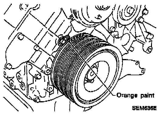 Align the timing mark (orange paint) on crank pulley with timing indicator on front cover.