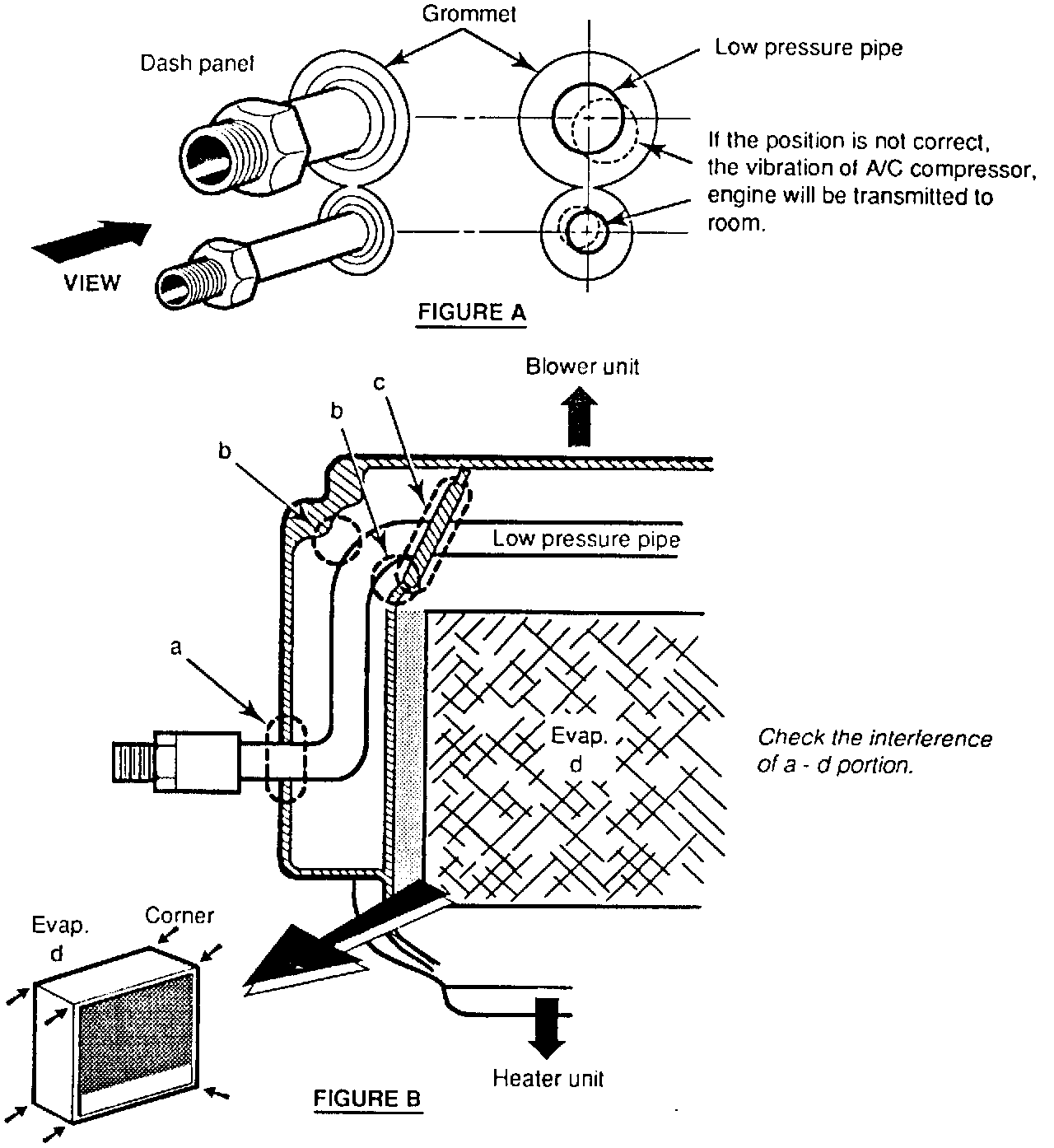 1) Check the A/C low pressure pipe at the dash panel. It should be located at the center of the grommet. (Fig. A) Reposition the A/C low pressure pipe if necessary.