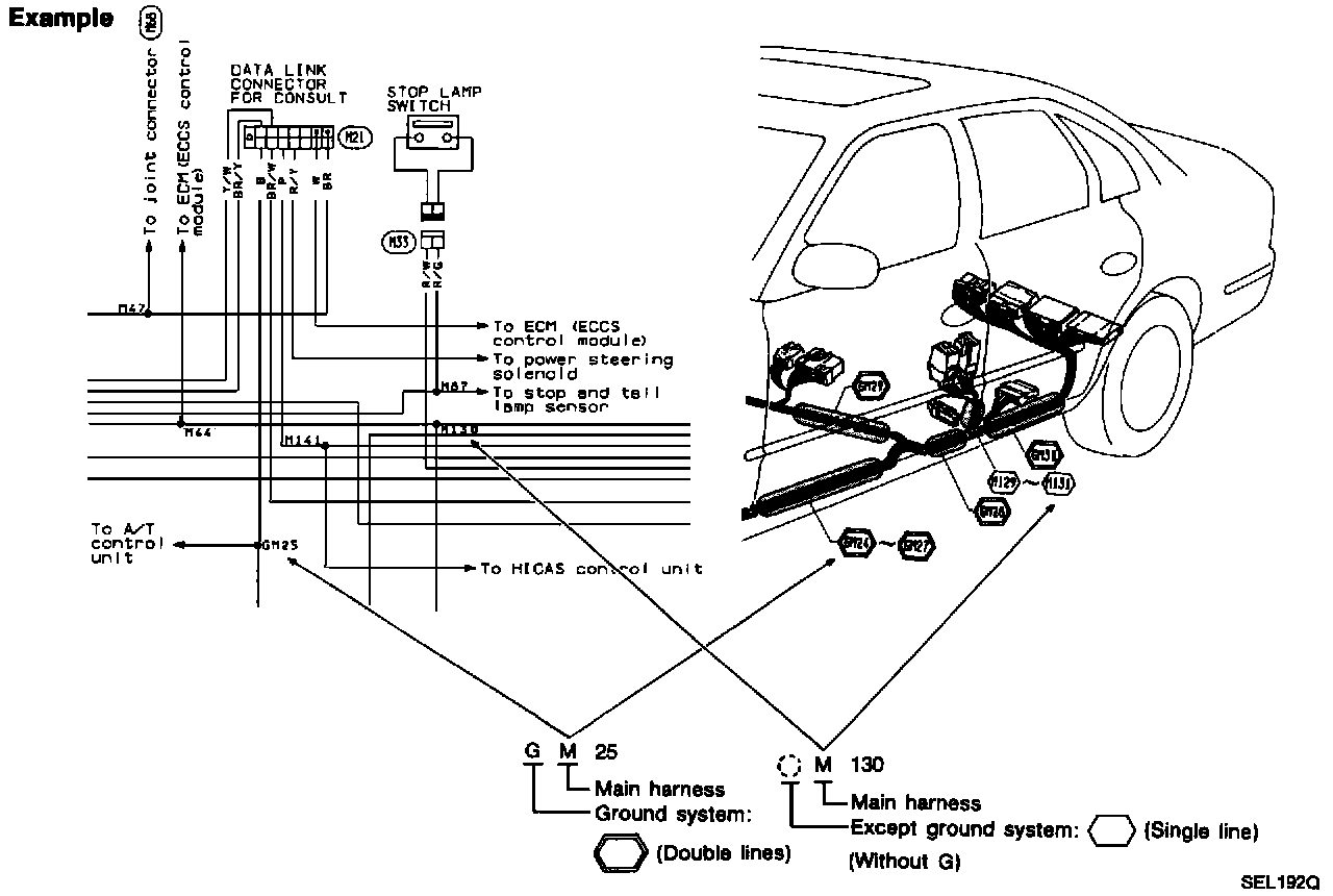 ^ "GM25","M130" etc., which are shown in the wiring diagram, refer to wiring harness splice points. These points are located in shaded areas "(GM25)", "(MJ31)", etc. in illustrations under the title 'SPLICE LOCATION".