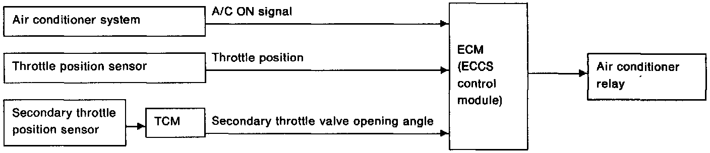 When the ECCS Control Module senses that the throttle valve fully depressed, via the throttle sensor, it opens the ground circuit to the A/C relay. This cuts voltage to the A/C clutch.