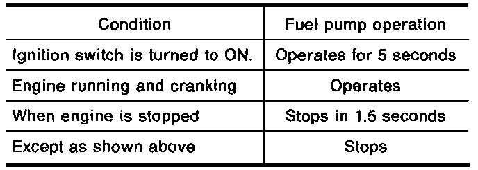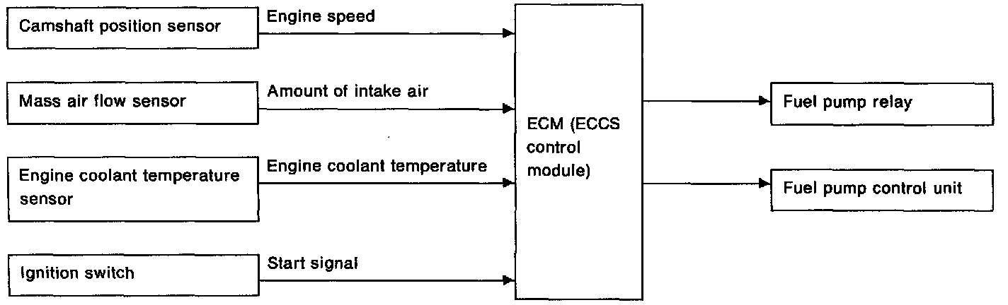 The ECCS Control Module (ECM) activates the fuel pump for several seconds after the ignition switch is turned on to improve engine start-up. If the ECM receives an 1° signal from the camshaft position sensor, it knows that the engine is rotating, and causes the pump to activate. If the 1° signal is not received when the ignition switch is on, the engine stalls. The ECM stops pump operation and prevents the battery from discharging, thereby improving safety. The ECM does not directly drive the fuel pump. It controls the ON/OFF fuel pump relay, which in turn controls the fuel pump.