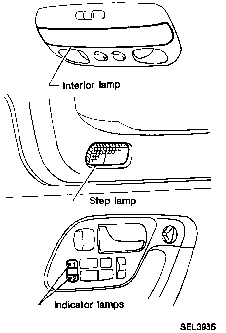 An interior lamp, step lamps (all seats) and automatic drive positioner indicator lamps have been adopted on the model. These lamps blink simultaneously in response to self-diagnostic results.