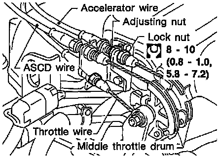 1. Loosen lock nut, and tighten adjusting nut until middle throttle drum starts to move.