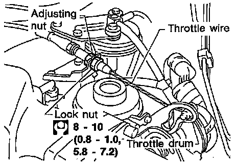 1. Loosen lock nut, and tighten adjusting nut until throttle drum starts to move.