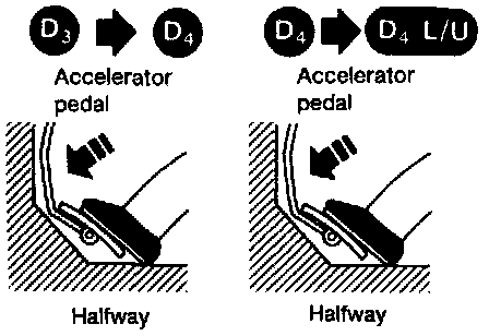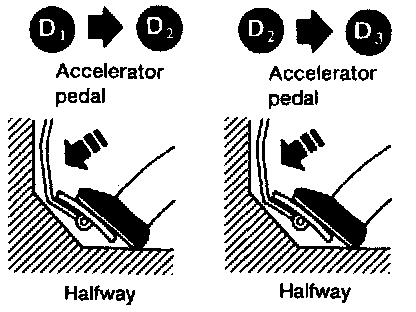 3) Start vehicle with selector lever in D and throttle opening halfway. Check that vehicle runs through gear shift of D1 - D2 - D3 - D4, in accordance with shift schedule. Refer to shift schedule.
