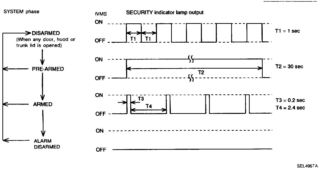 The theft warning system is in the disarmed phase when any door(s), hood or trunk lid is opened. The security indicator lamp blinks every second.