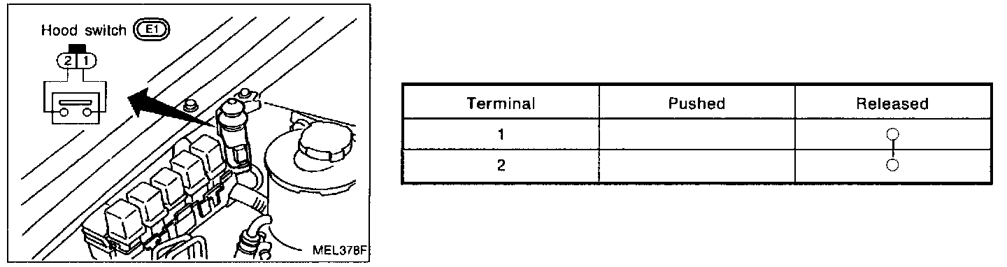 Check continuity between terminals when hood switch is pushed and released.