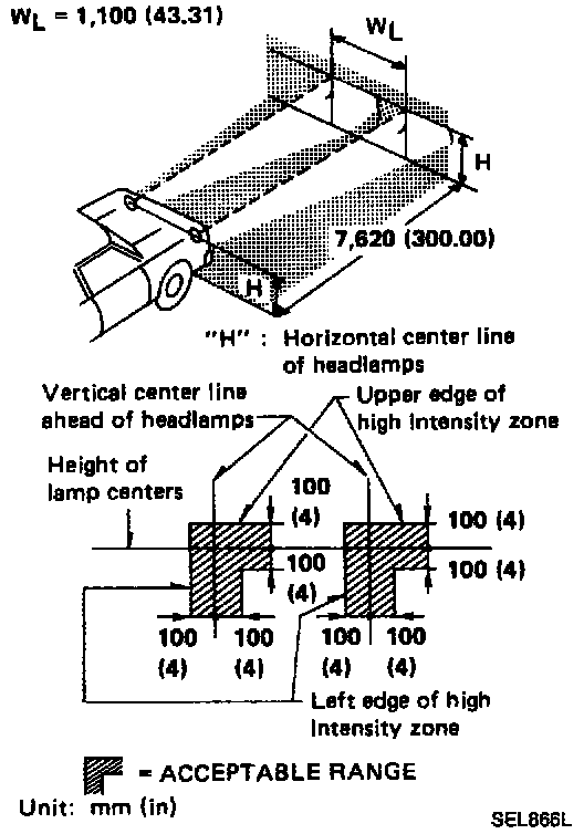 ^ Upper edge and left edge of high intensity zone should be within the range shown at left. Adjust head lamps accordingly.