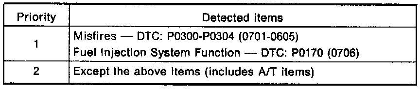 The data can be stored only for the 1st trip. It can not be renewed even at the 2nd trip. The freeze frame data can be stored for only one item. Therefore, the ECM has the priorities in the chart above to update the data.