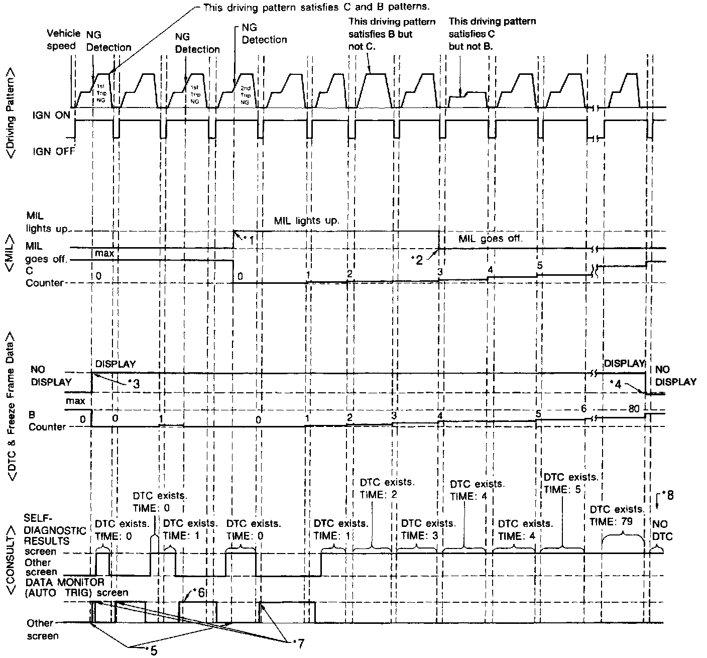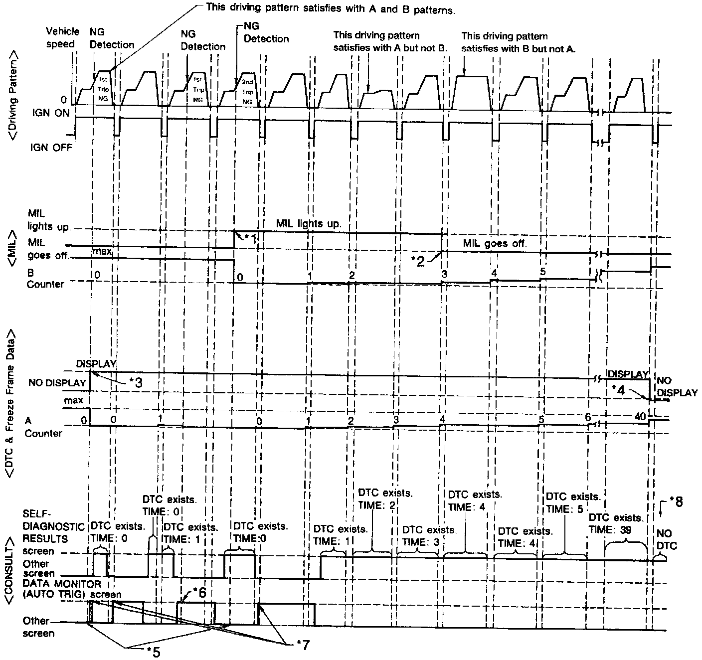 - The B counter will be cleared when the malfunction is detected twice regardless of the driving pattern (*1 in "OBD SYSTEM OPERATION CHART").