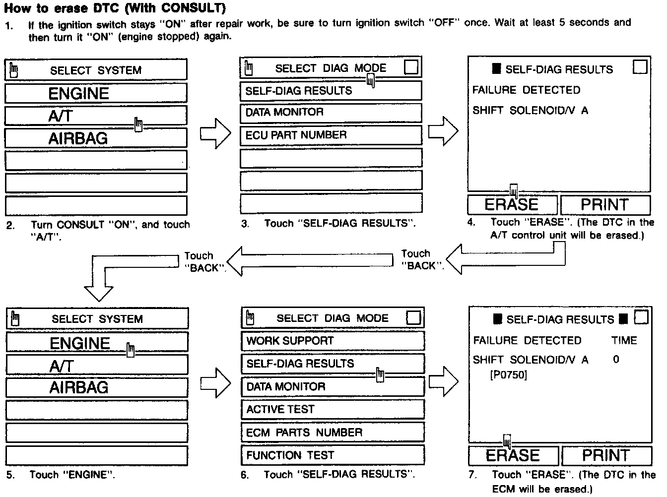 4. Touch "ERASE". (The DTC in the A/T control unit will be erased.) Touch "BACK" twice.