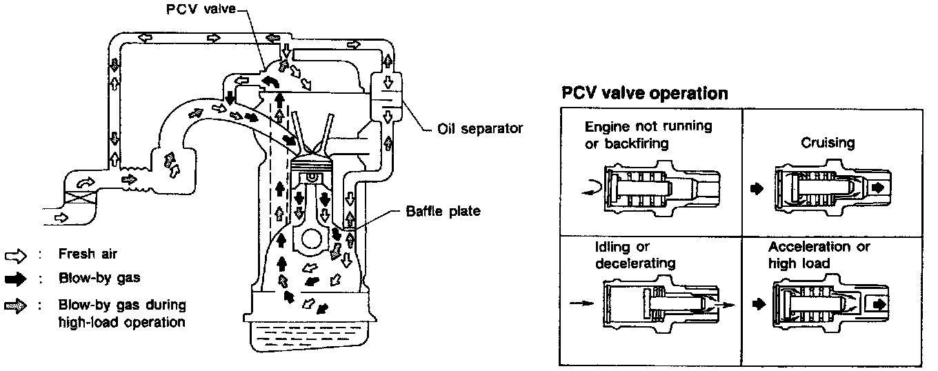 Under full-throttle condition, the manifold vacuum is insufficient to draw the blow-by flow through the valve. The flow goes through the hose connection in the reverse direction.