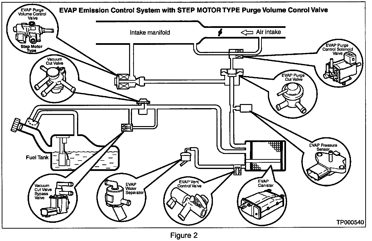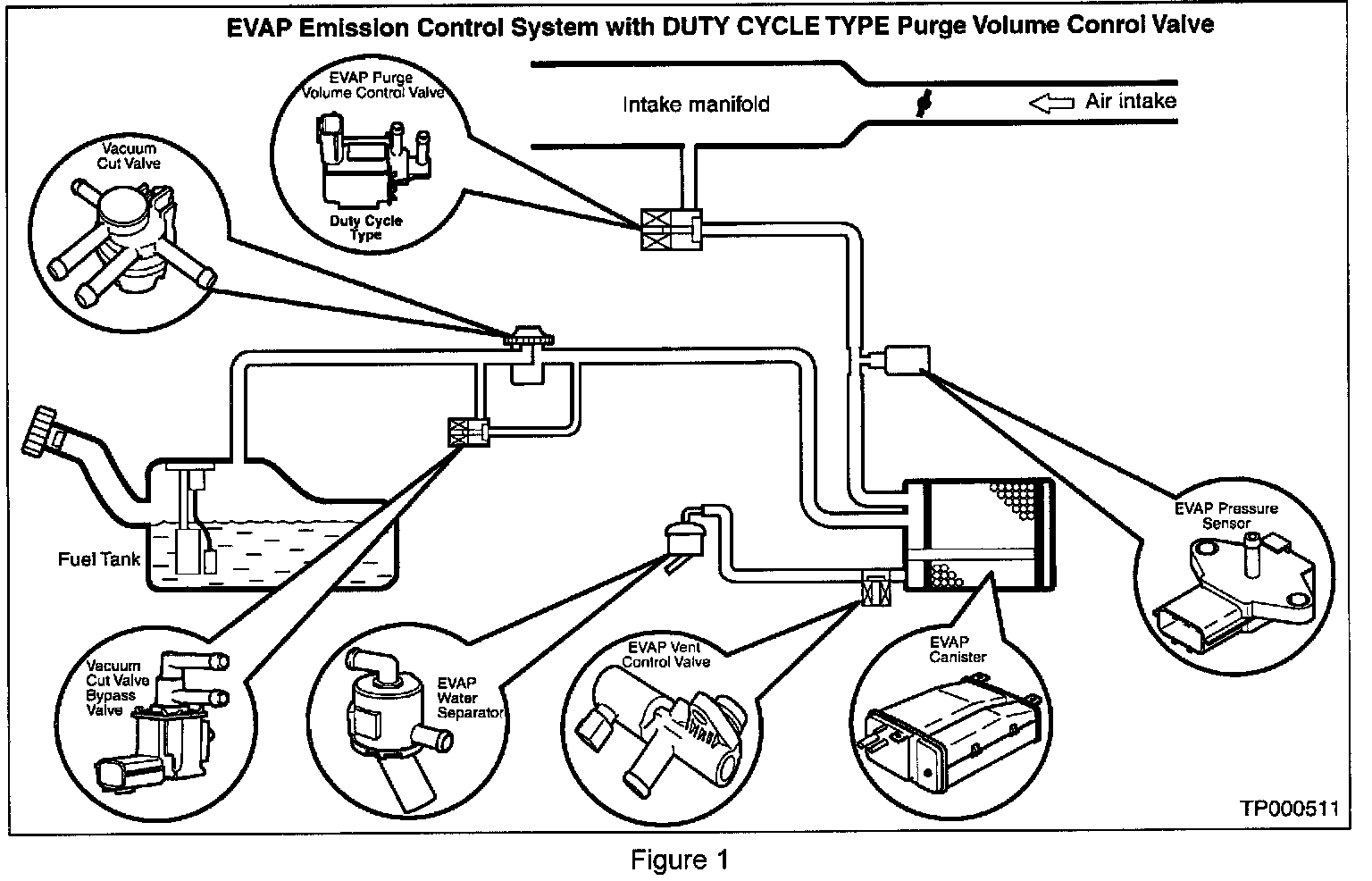 There are two different types of EVAP Purge Volume Control Valves (i.e., the duty cycle type and the step motor type). Depending on the valve type, different hoses need to be disconnected (from the valve) to preform the cleaning procedure (discussed later in this bulletin). Refer to Figures 1 and 2 to determine the system variation you are working with.