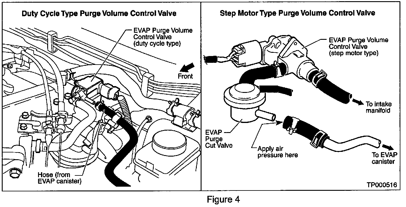 Refer to Figures 1, 2, and 4 to determine which hose to disconnect based on the type of Purge Volume Control Valve on the vehicle (i.e., duty cycle or step motor type).