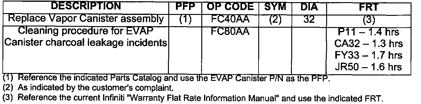 For replacement of the EVAP canister and EVAP system charcoal debris cleaning/removal, submit a Primary Failed Part (PP) line claim using the table as shown for claims coding. To claim for diagnostic time(s) associated with the DTC code(s) and/or the replacement of those components that have been rendered nonfunctional due to charcoal contamination, reference the current Infiniti "Warranty Flat Rate Information Manual" and use the indicated Op Codes and FRTs:
