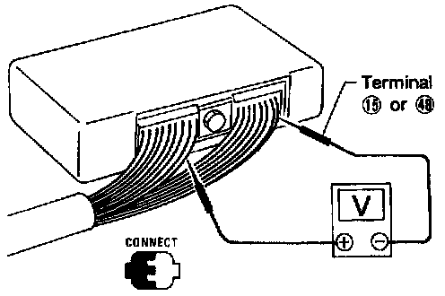 - Measure voltage between each terminal and terminal (15) or (48) by following "A/T CONTROL UNIT INSPECTION TABLE".