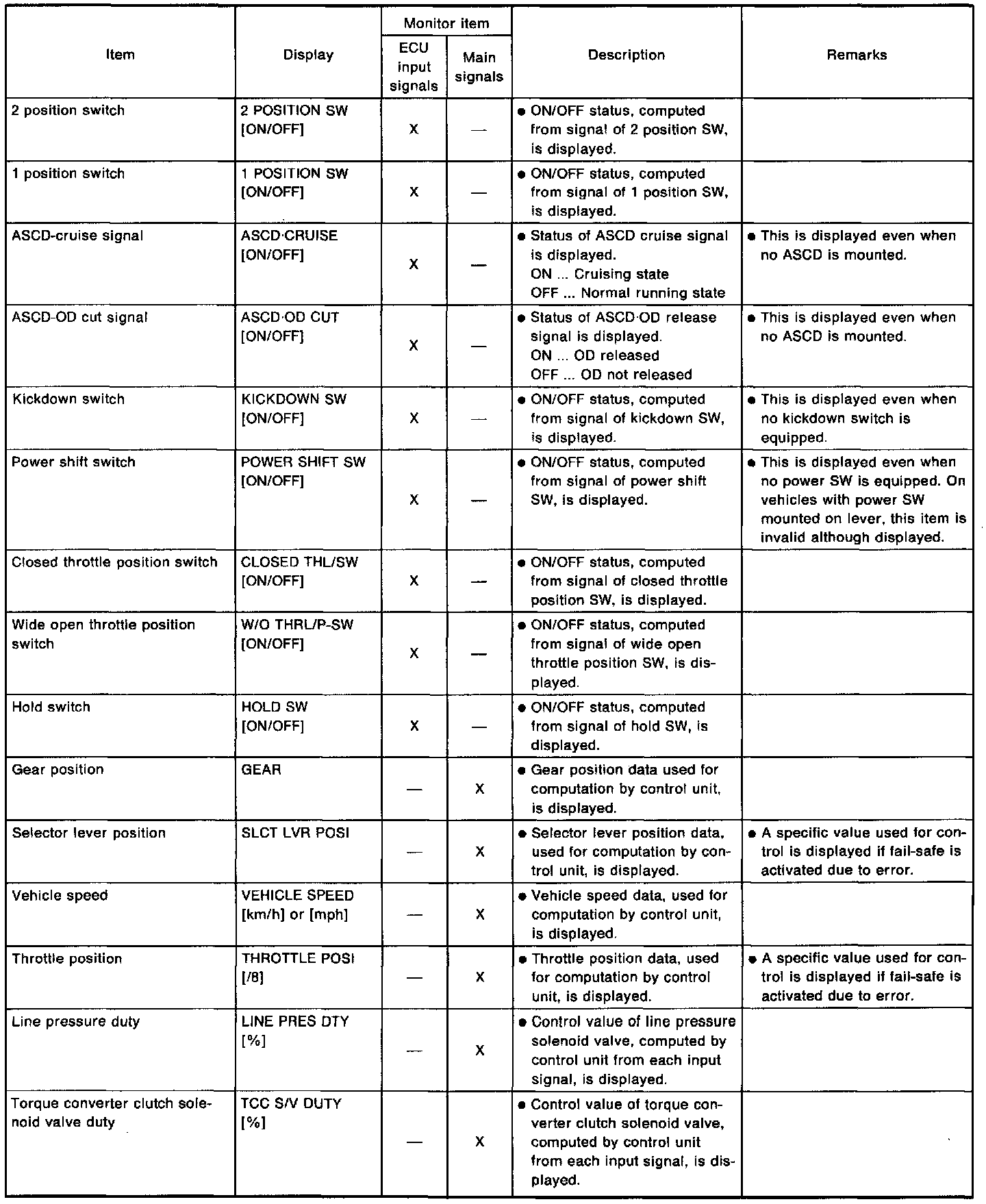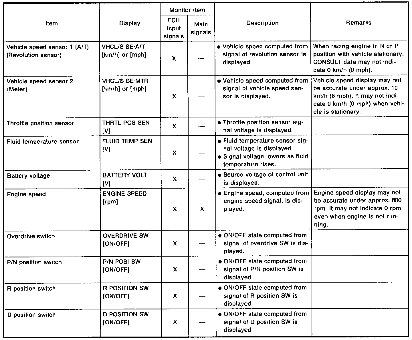 2. Shift schedule (which implies gear position) displayed on CONSULT and that indicated in Service Manual may differ slightly. This occurs because of the following reasons: