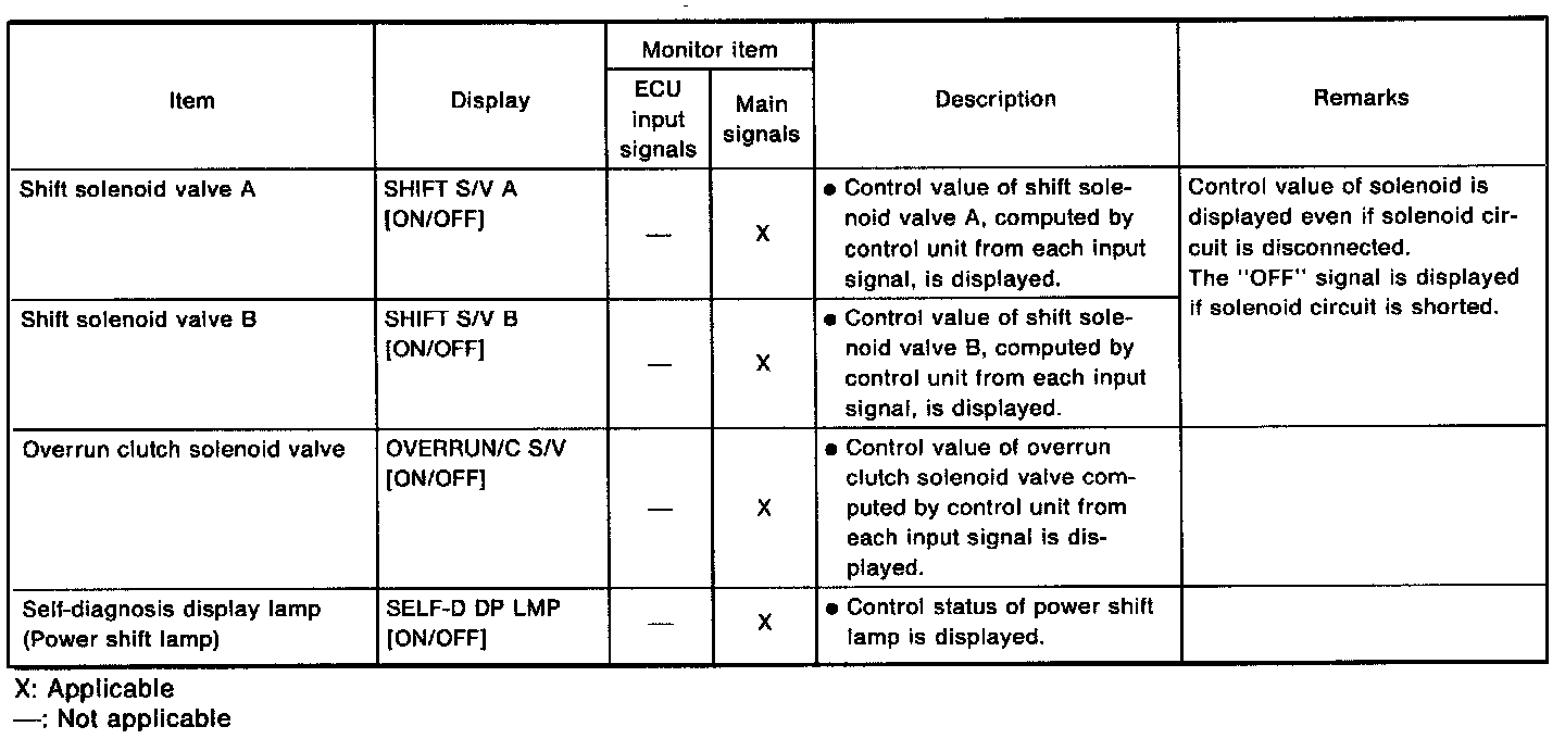 3. Shift solenoid valve "A" or "B" is displayed on CONSULT at the start of shifting. Gear position is displayed upon completion of shifting (which is computed by A/T control unit).